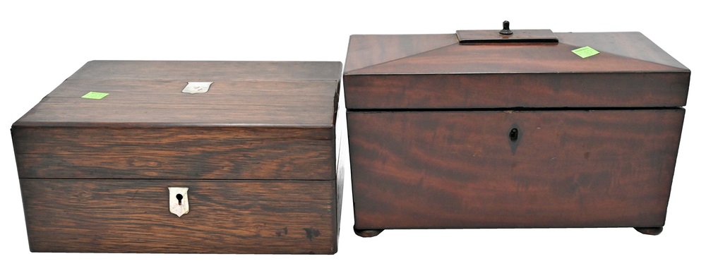 Two Boxes, to include rosewood sewing box having velvet fitted interior, along with a tea box, sewing height 7 3/4 inches, top 6″ x 12″, tea height 5 inches, top 8″ x 11″.