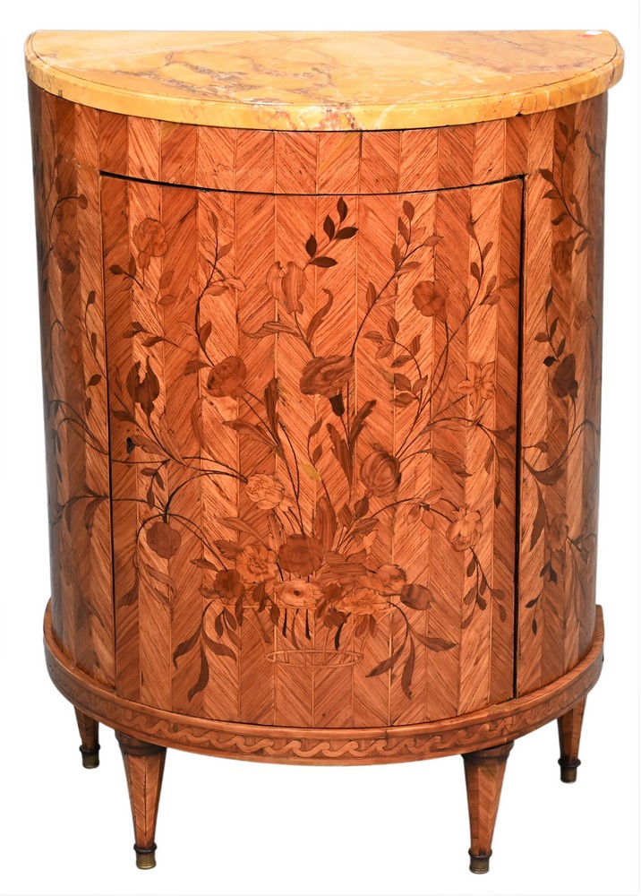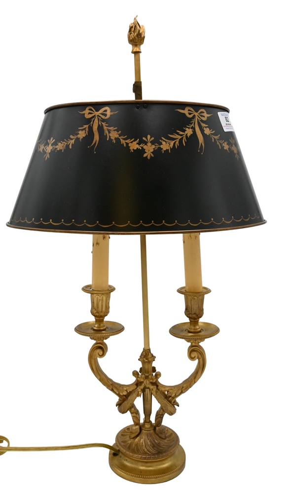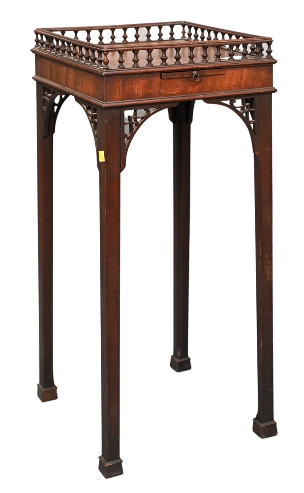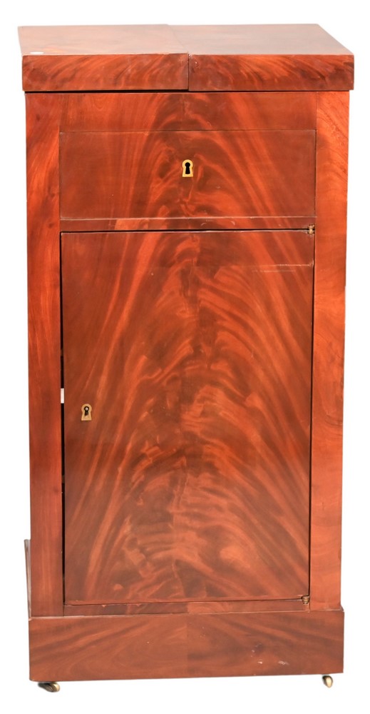 Two Piece Lot, to include mahogany wash stand, having two door top interior with granite and bowl, wash bowl height 39 inches, top 15″ x 19″; along with Hinks and Sons bronze and gilt bronze piano lamp, having adjustable height, gilt rams heads, not electrified, table height 28 1/2 inches.
