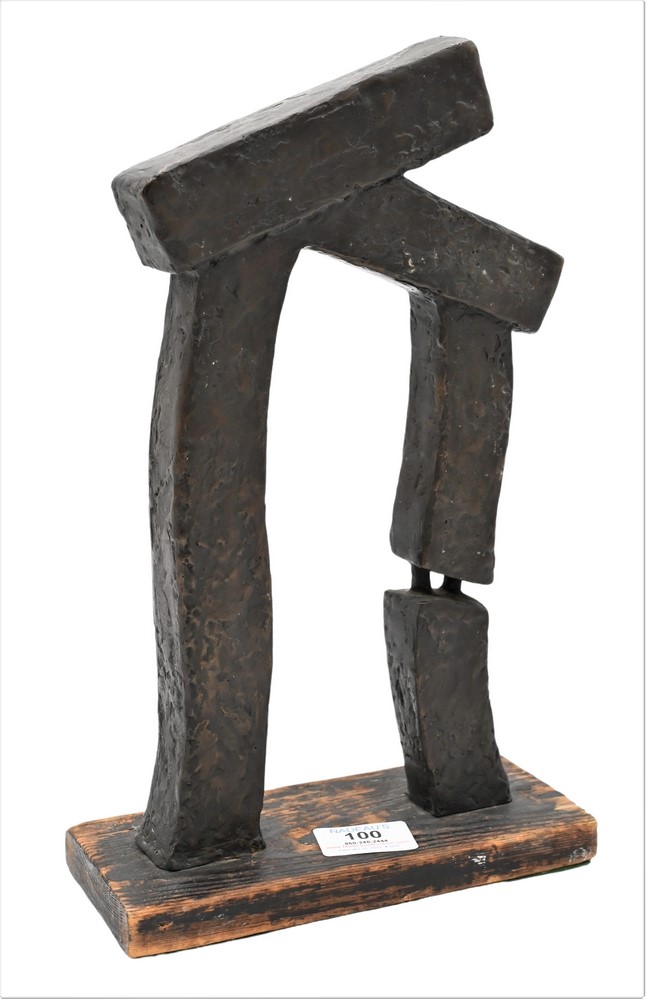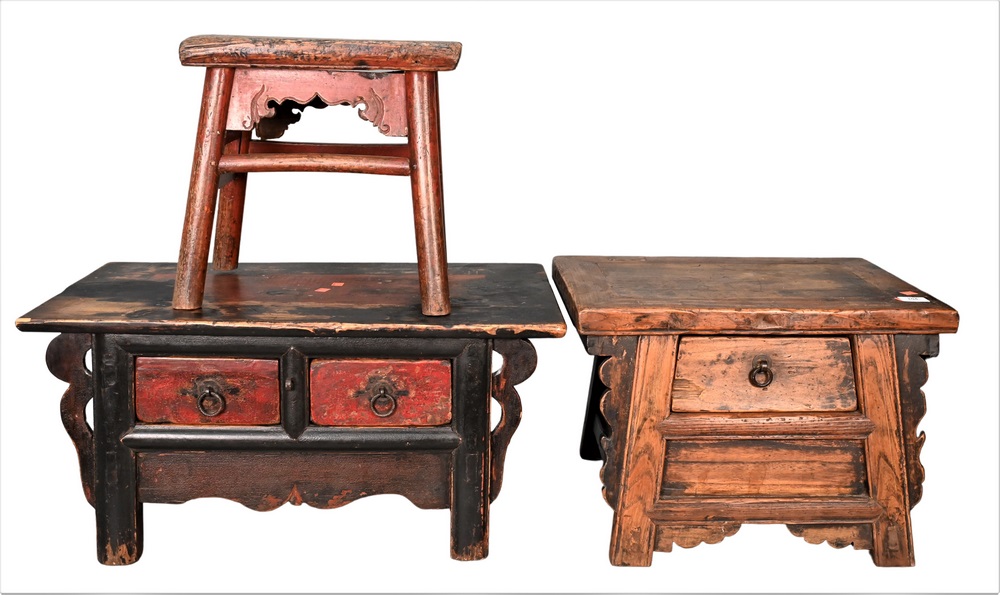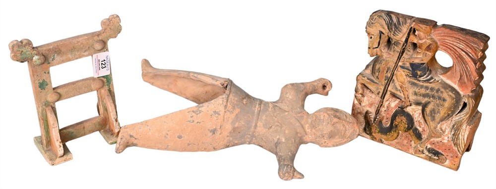 Group of Three Chinese Items, to include a Chinese glazed pottery rack, Ming period, height 8 inches, width 6 1/4 inches; a terracotta figure, height 13 inches; along with a carved and painted wood warrior on horse height 8 inches, Ancient Art International certificate of authenticity and receipt for pottery clothes rack. Provenance: From a private New York City collection.