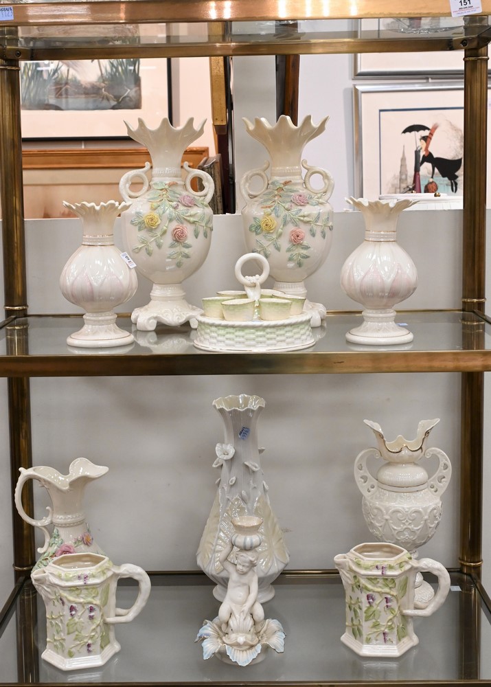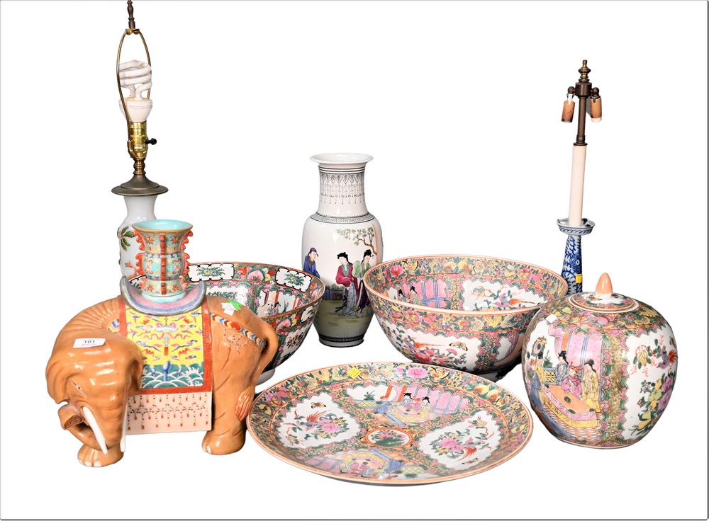 Eight piece Chinese Porcelain Group, to include a Rose Medallion style bowl, large Famille Rose elephant, blue and white candlestick, overlay vase made into a table lamp, etc, height 26 inches.