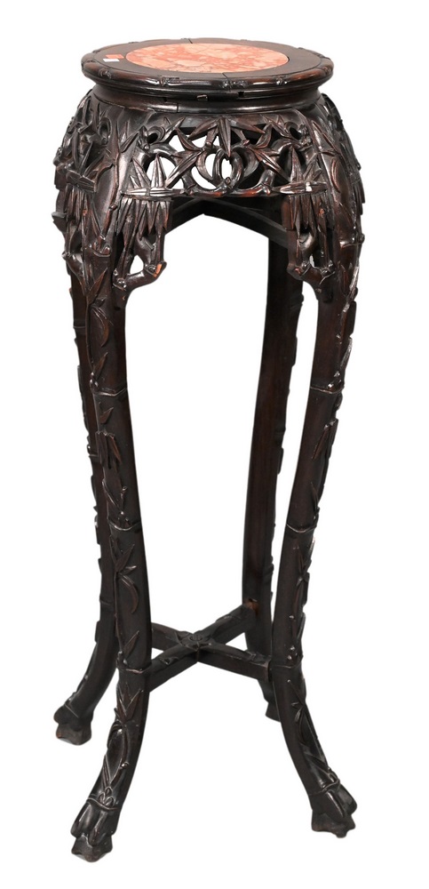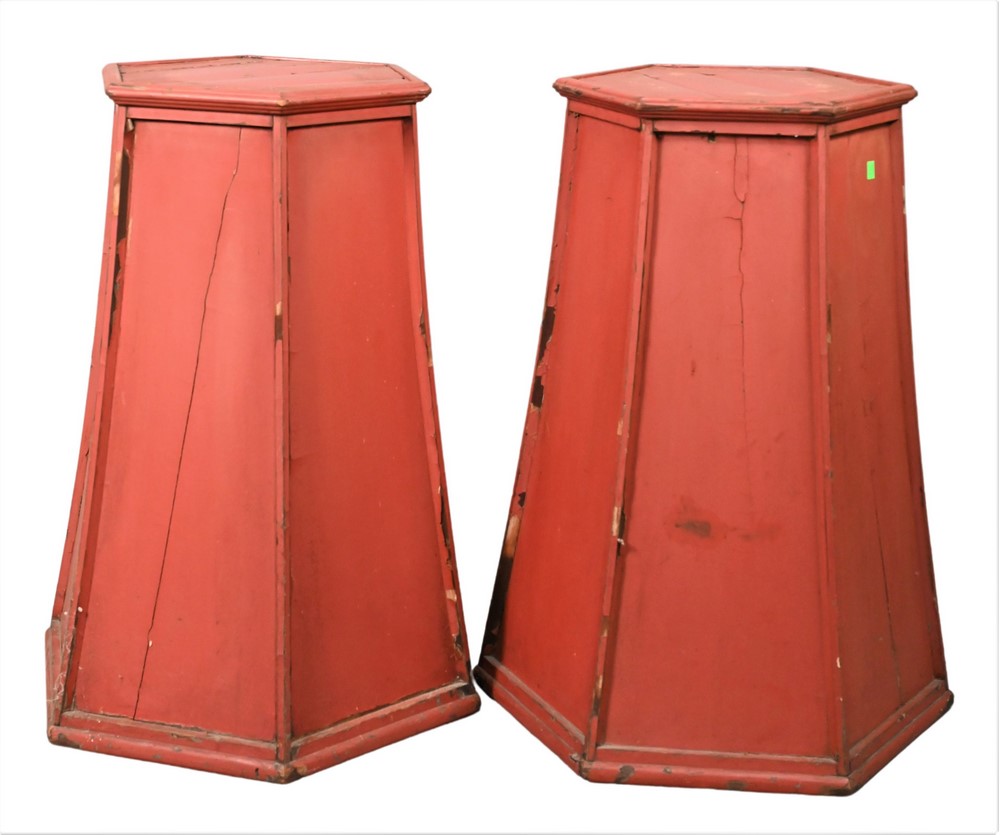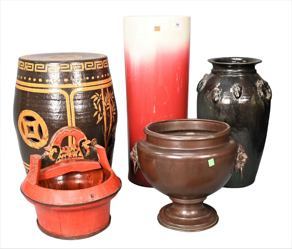 Five Piece Group of Assorted Asian Items, to include sang de boeuf umbrella stand, green glazed vase with applied mask, brown and yellow glazed garden seat, bronze pot and red lacquered box, tallest 24 1/2 inches.