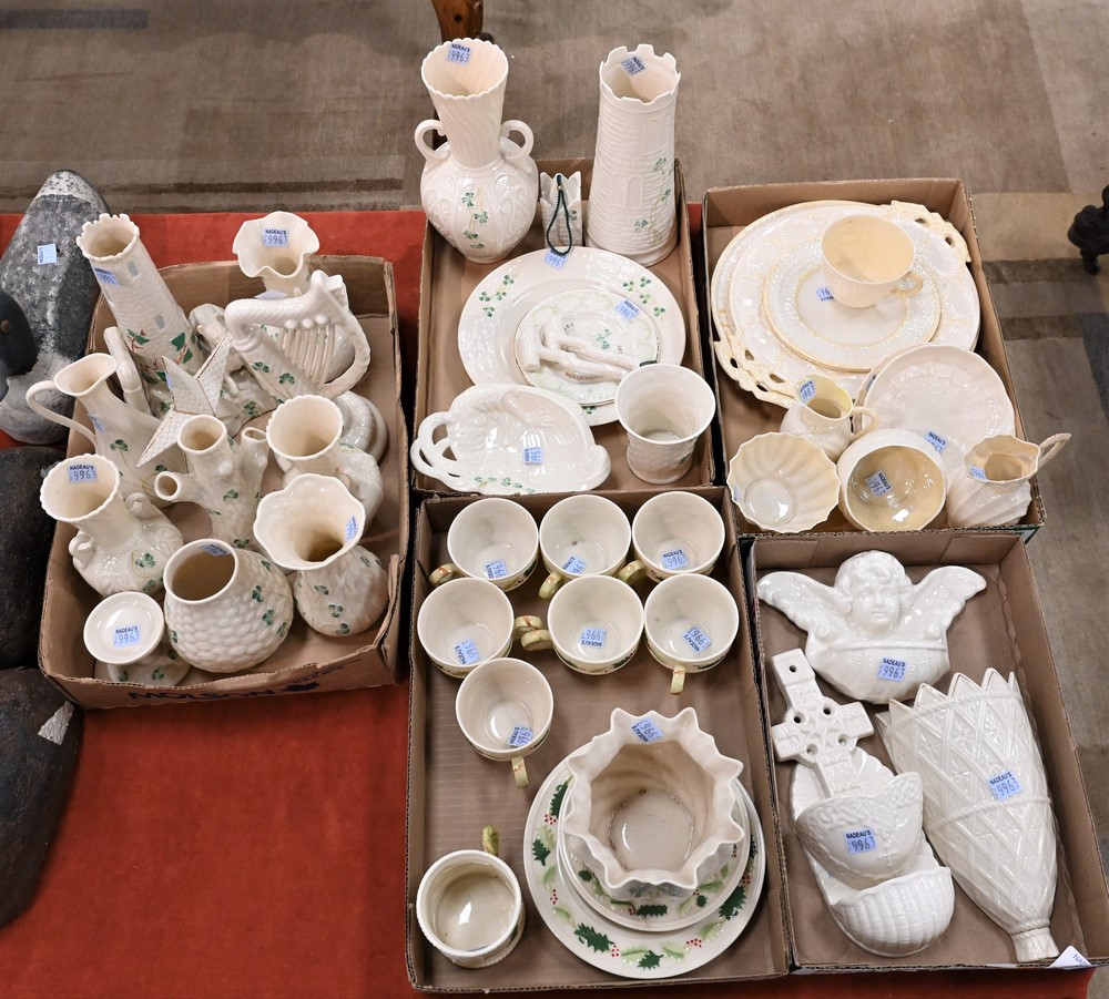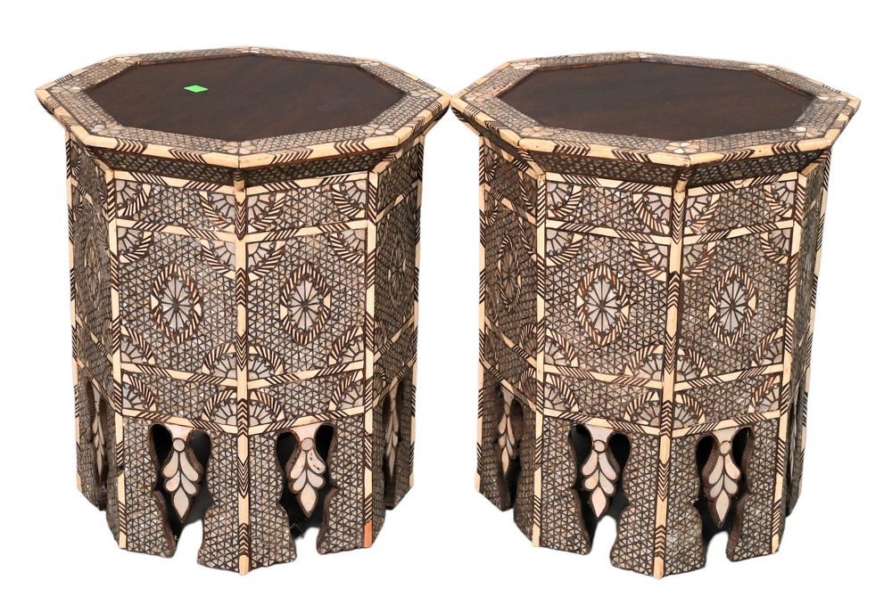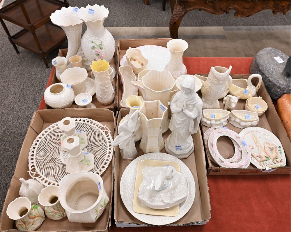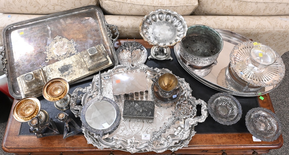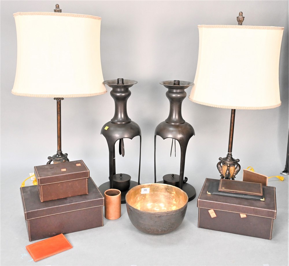 Group of Decorative Items, to include a pair of bronze Japanese style candlesticks, pair of decorative table lamps, a hand hammered silvered bowl, and a group of leather boxes and desktop items from Estate of Peggy and David Rockefeller, height 34 inches.