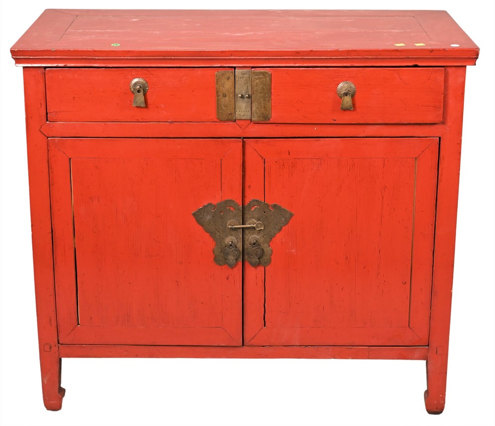 Chinese Red Lacquered Cabinet, parcel gilt and painted landscape scene, having lift top over two doors with fitted drawer interior, height 17 1/2 inches, width 18 inches.