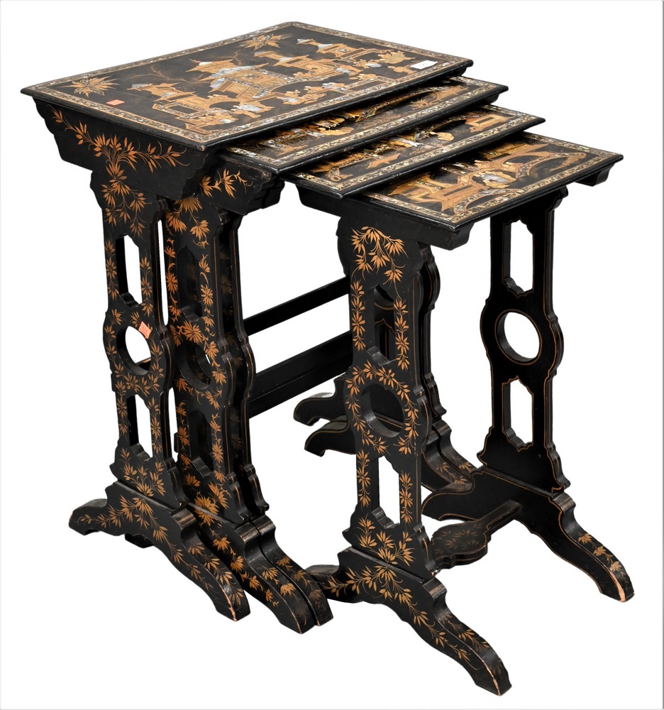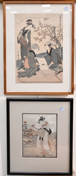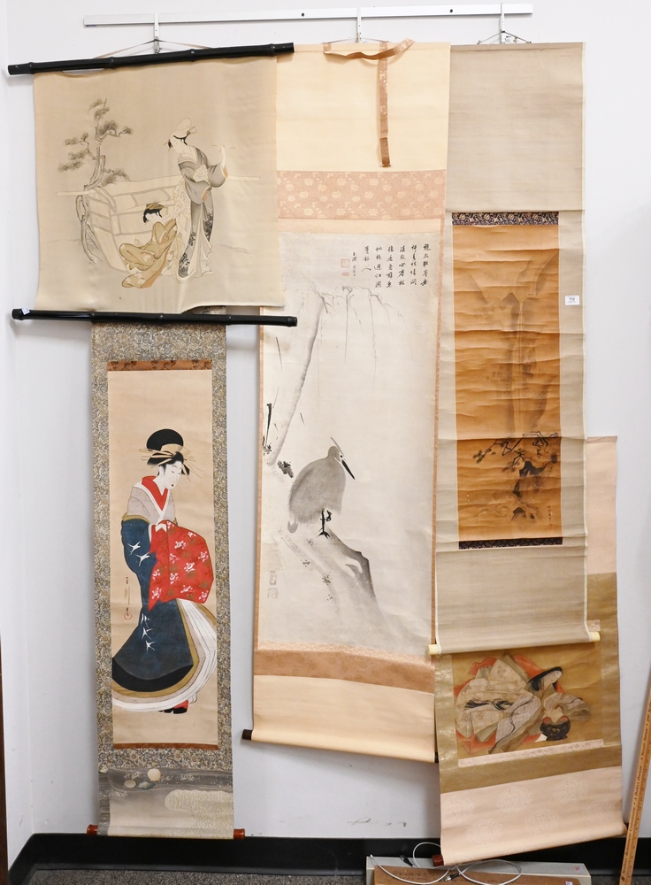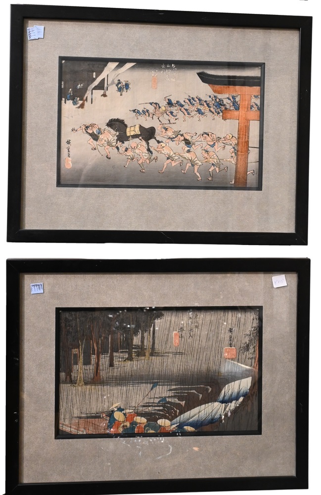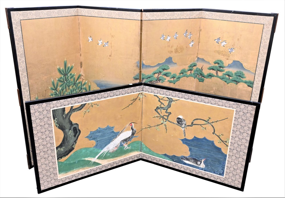 Two Oriental Folding Screens, to include large four fold screen having landscape scene, height 43 1/4 inches, width 81 inches; along with a two fold screen having birds, height 24 3/4 inches, width 58 1/2 inches.
