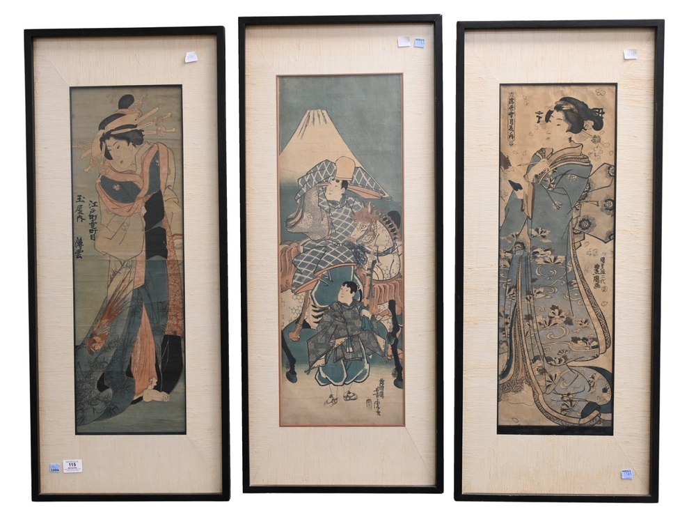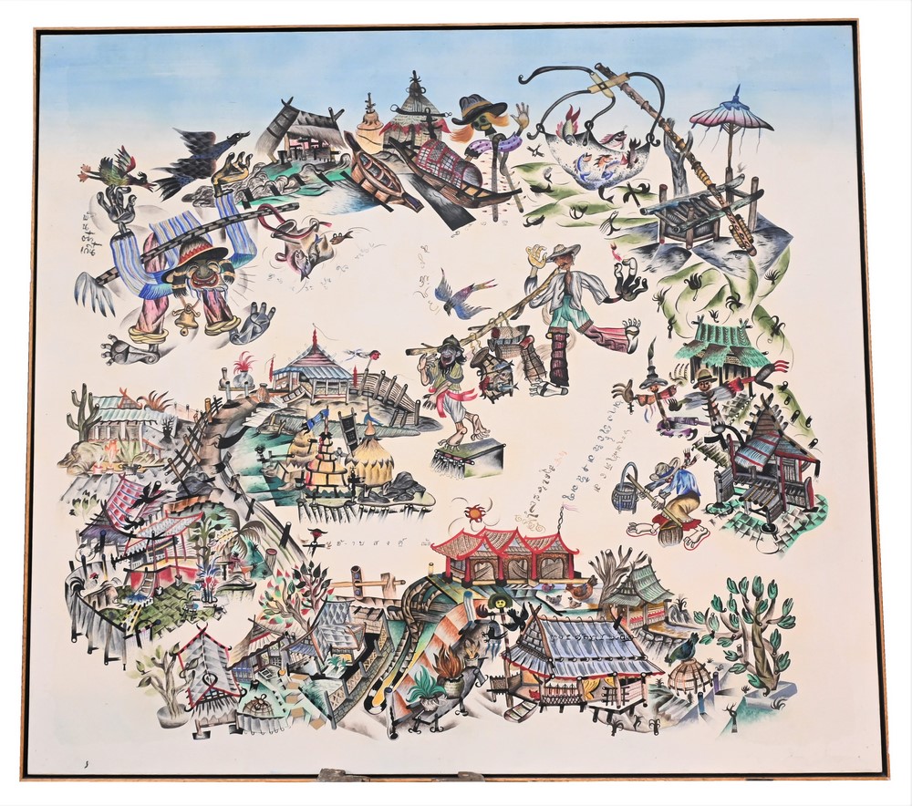 Two Framed Paintings, to include landscape voyage, signed illegibly 1962, along with tibetan watercolor on cloth with figure, landscape 52 1/2″ x 57 1/2″, cloth 22″ x 75″.