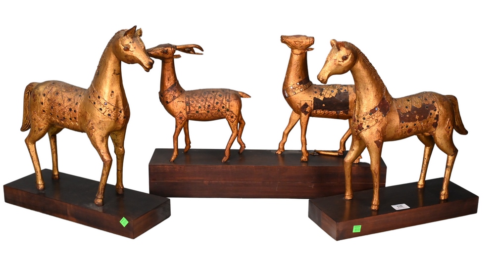 Set of Four Carved and Giltwood Tibetan Animals, to include a pair of horse’s mounted with colored glass jewels on wood bases along with two deer on a wooden base, length 24 inches, height 15 inches.