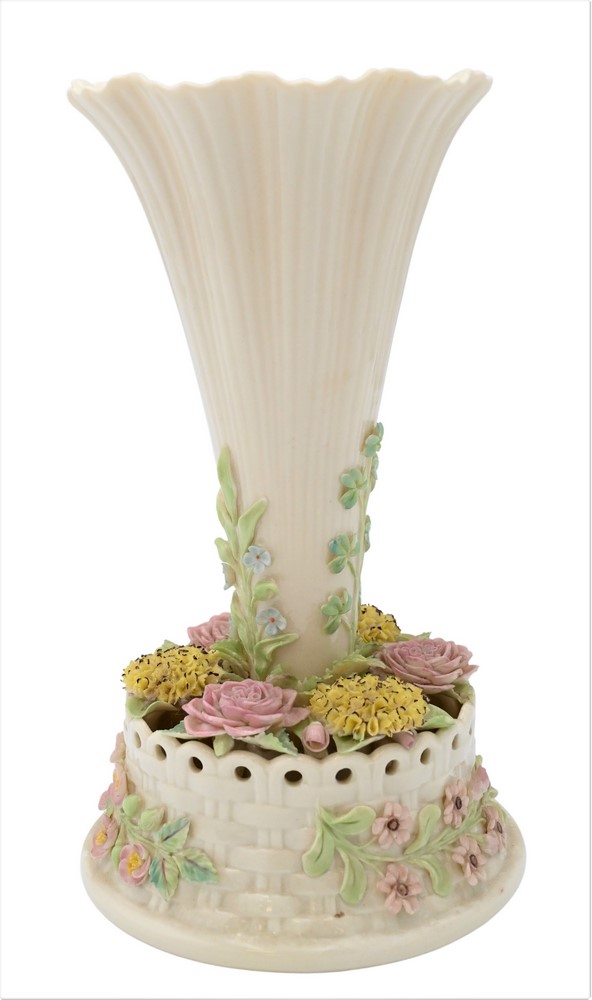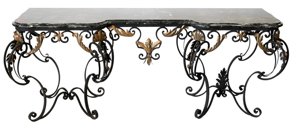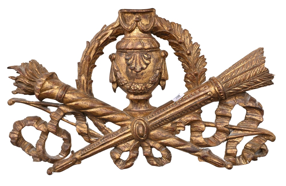 Carved and Giltwood Wall Architectural Pediment, having urn flanked by acanthus leaves above a torch crossed with a quiver of arrows and ribbon accents, 19 1/2″ x 32″.