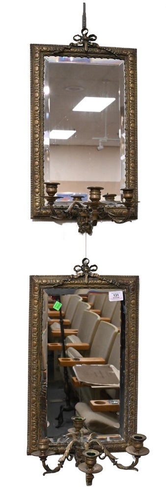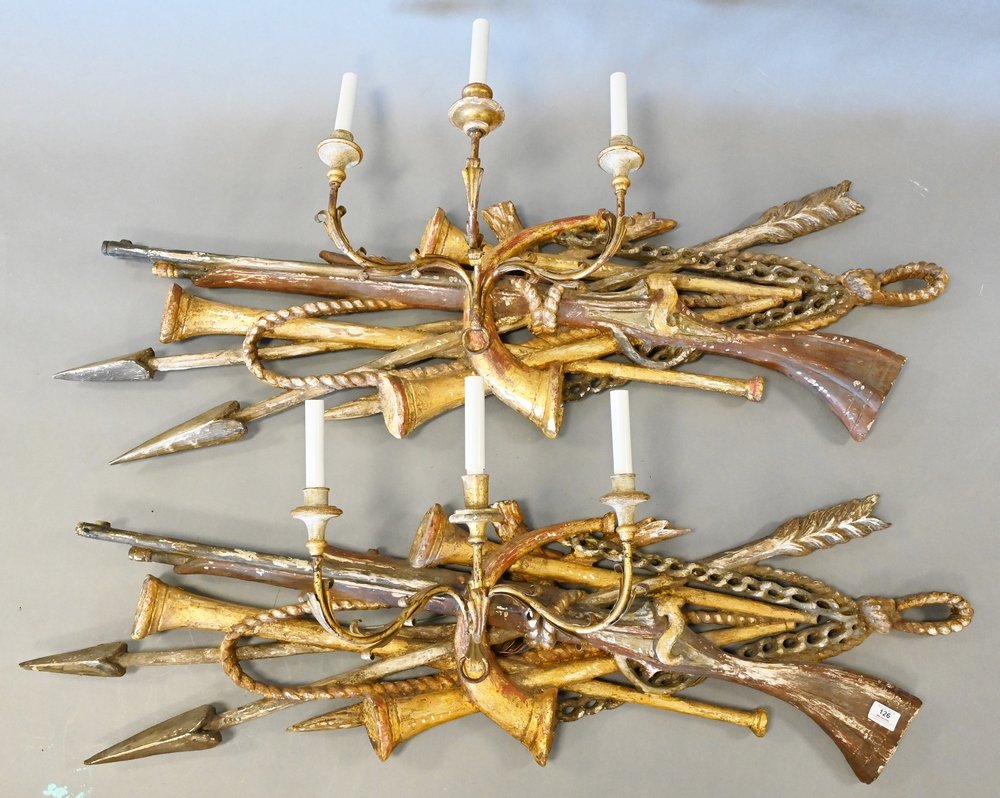Pair of Giltwood and Gesso Wall Sconces, each in the form of a rifle, horn, arows and rope, having three arms with electrified candle holders, height 21 inches, 51 inches.
