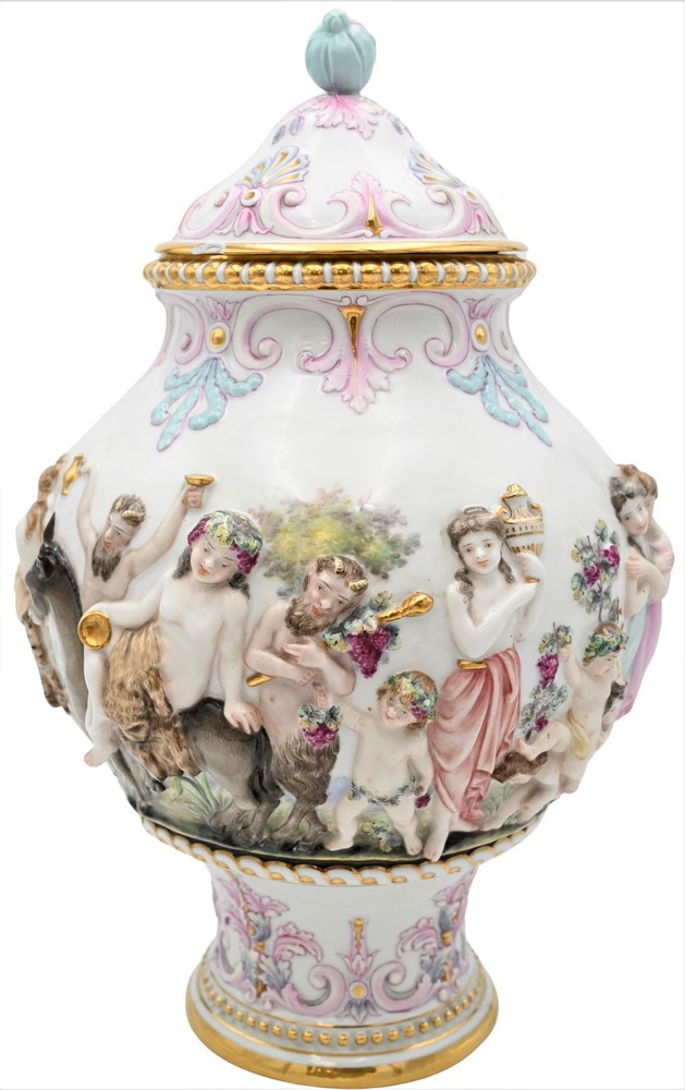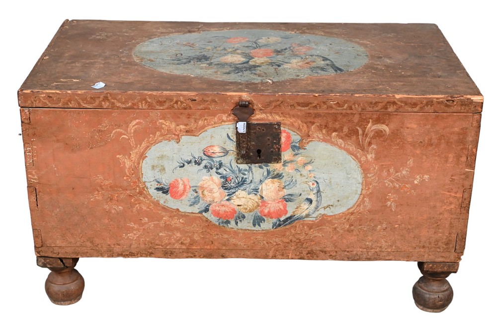 Continental Lift Top Chest, on ball feet having painted panels of flowers and birds, 18th century – early 19th century, height 18 1/2 inches, top 17 1/2″ x 31 1/2″.
