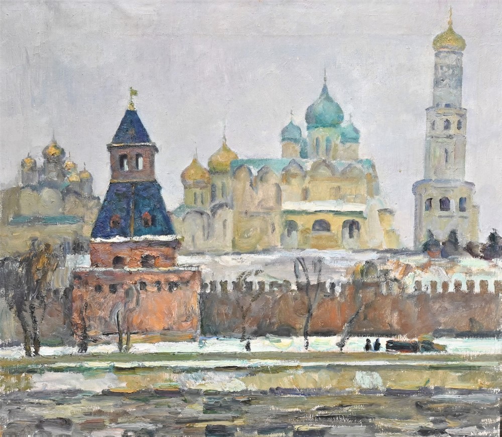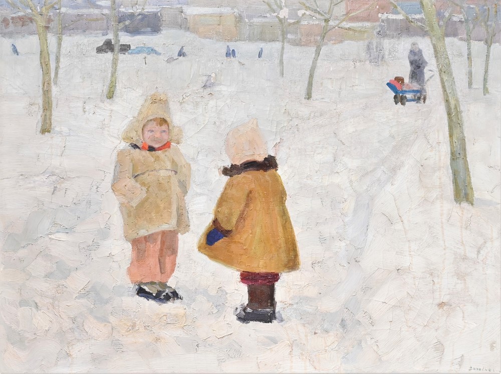 Russian Landscape, having two children outside in the snow, oil on canvas, signed illegibly lower right, dirty, paint lifting and chipping, small hole, 28″ x 36″.