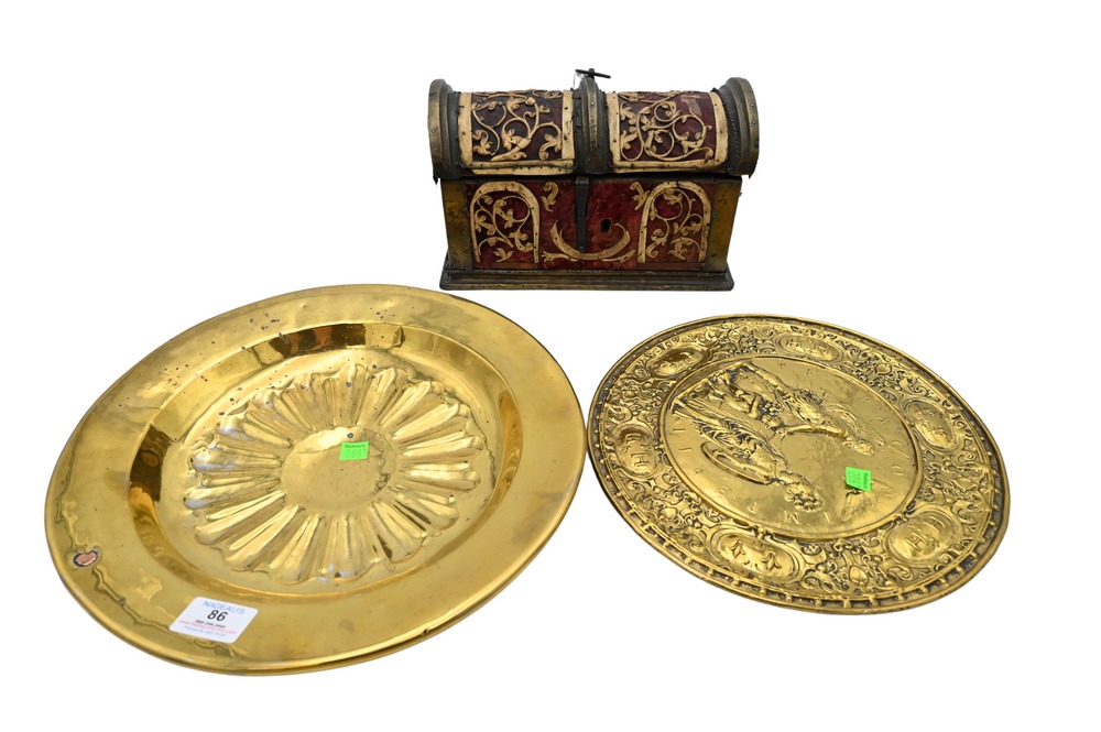 Three Piece Group, to include Alms dish with ribbed interior, probably 17th – 18th century, brass plaque depicting Henry IV as mars and marie de medicis a minerva with Louis XIII a Dauphin, along with a brass bound dom top box, diameter 11 3/4 inches, 13 3/4 inches.