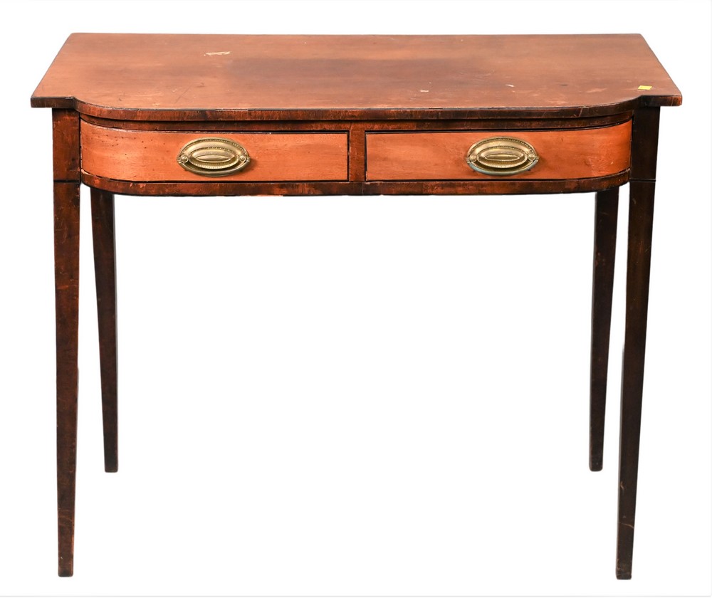 Federal D Shaped Table, having two drawers on square tapered legs, under drawer pencil signed William George Payne High Street_______, circa 1800, height 29 1/2 inches, top 19″ x 35 1/2″.