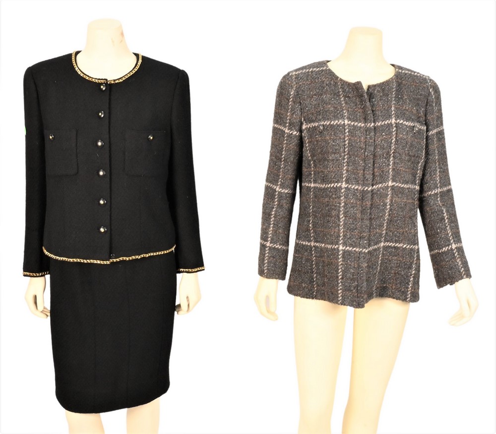 Chanel Black Suit and Grey Plaid Jacket, two piece skirt and jacket having chain link detail, along with a wool zip front jacket having silk lining; size medium, condition consistent with wear, no issues.