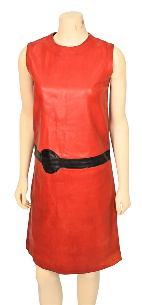 Pierre Cardin Iconic “Space Age” Red Leather Dress, 1960’s – 1970’s, scoop neck, sleeveless, zip back, top stitch detail, size S/M, condition consistent with age, no rips, needs cleaning.