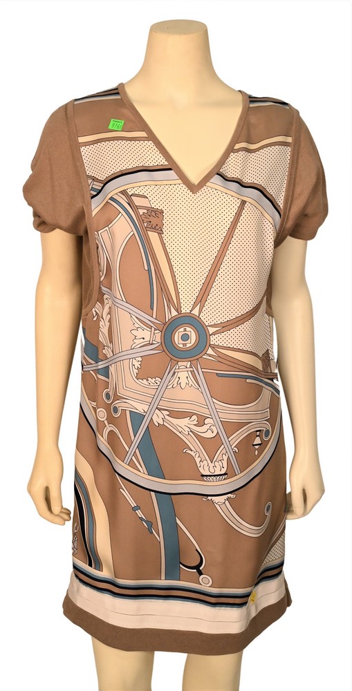 Vintage Hermes Silk and Jersey Knit Dress, 1970’s – 1980’s, v-neck, short sleeve, front silk pattern panel, size medium, slight stains in three places.