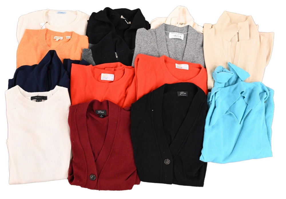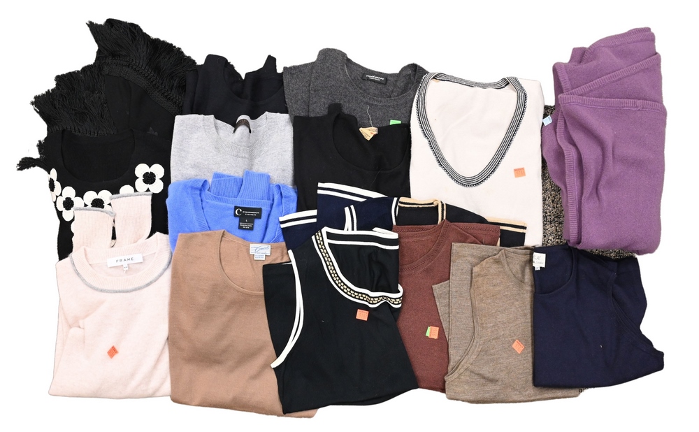 Large Lot of Designer Sweaters, over 24 pieces in a variety of colors and styles, Grand, TSE, Prada, along with others, sizes medium to large, condition consistent with normal wear.