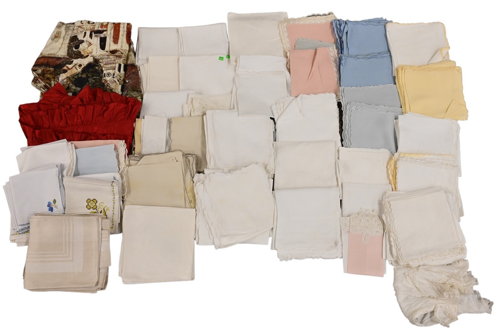 Miscellaneous Lot of Table Linens, to include a round linen Asian themed table cover, a red table cover, along with a large lot of napkin sets, including linen, Damask and cotton, various sizes, condition consistent with wear, some stains.