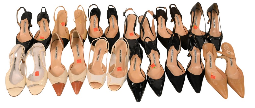 12 Pairs of Designer Shoes, to include 9 pairs of Manolo Blahnik slingback heels, along with Chanel and Rossi slingbacks, sizes 38 – 38 1/2, Rossi’s barely used, Blahniks have all been worn, Chanels have been restored.