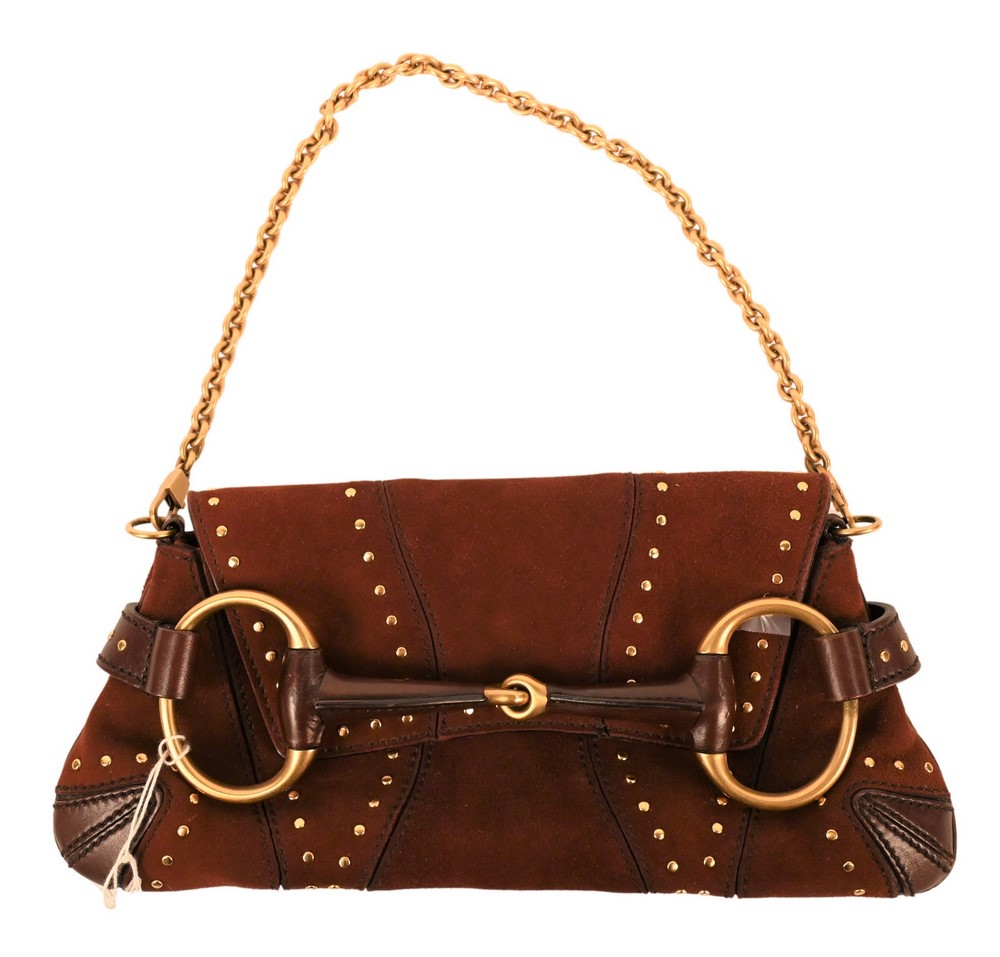 Gucci Brown Suede Horsebit Shoulder Bag, having brown leather, lined with single compartment and slip pocket, studded detail, gold tone hardware and chain link handle, height 5 inches, width 11 inches, in good condition.