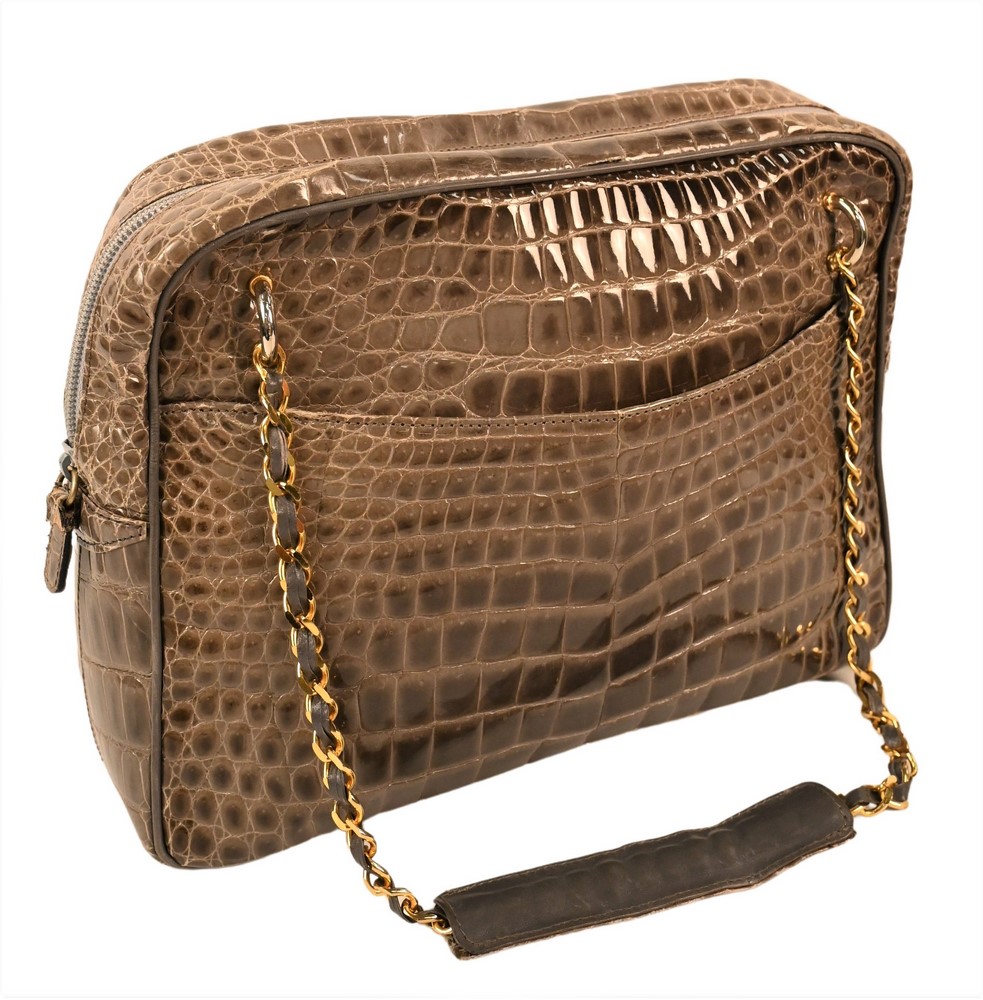 OGGI Crocodile Handbag, olive green, having single compartment, grey leather interior, zip and flip pockets, double gold tone chain link handle, two exterior slip pockets and top zip closure, condition consistent with age, made in Italy.