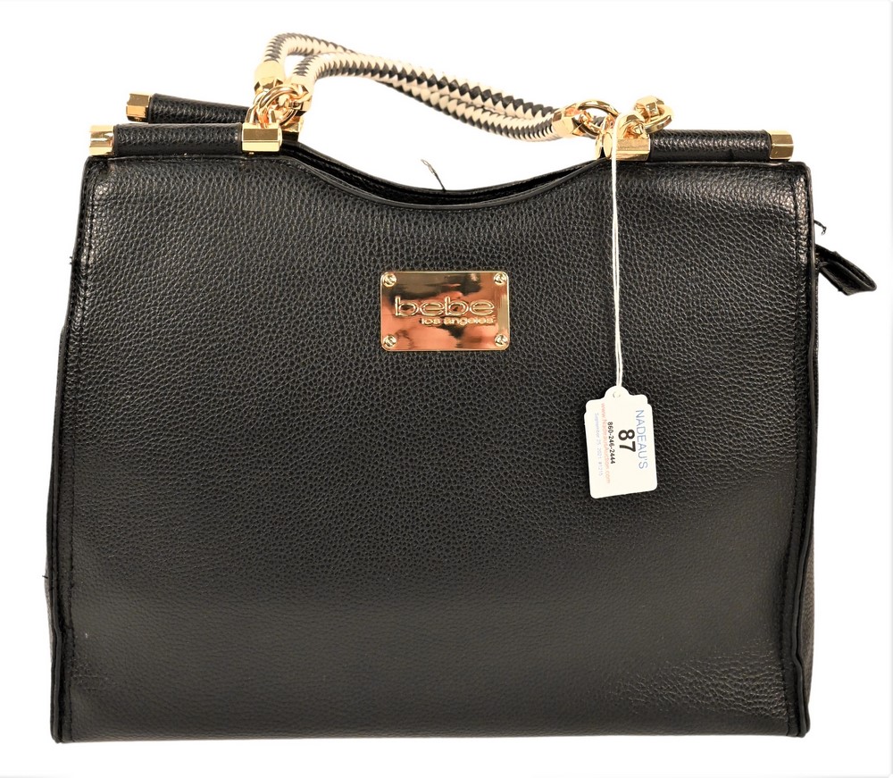 Bebe Black Leather Handbag, having single compartment, three interior pockets, gold tone hardware, black/white leather woven handles, in good pre-owned condition.