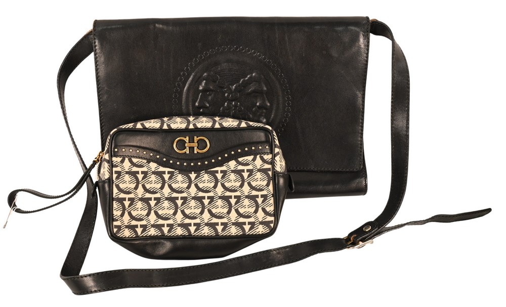 Two Piece Lot, to include vintage Fendi “Greek God” shoulder bag, having leather lined single compartment, gold tone hardware, and adjustable leather shoulder strap; along with a Ferragamo wristlet clutch, having black and white fabric; both in used condition, some scratches to leather, largest height 9 1/2 inches, width 12 1/2 inches.