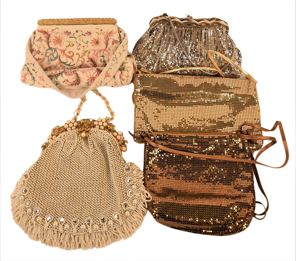Whiting & Davis and Vintage Beaded Bags, to include white beaded bag by Josef, pearl bag by Jacomo, and three Whiting & Davis mesh bags, all in good condition.