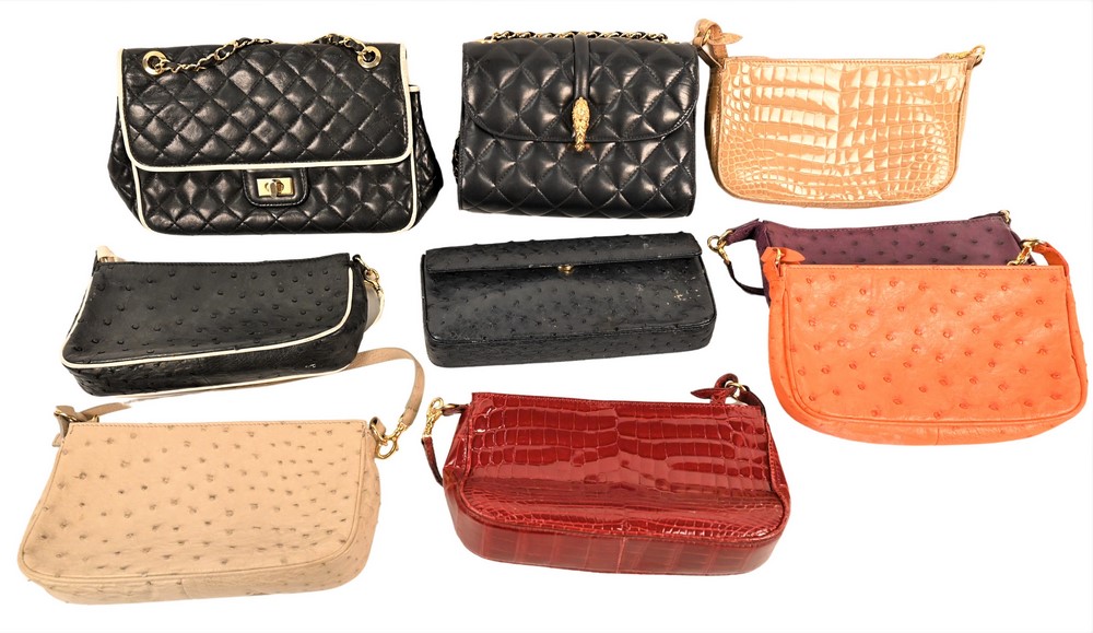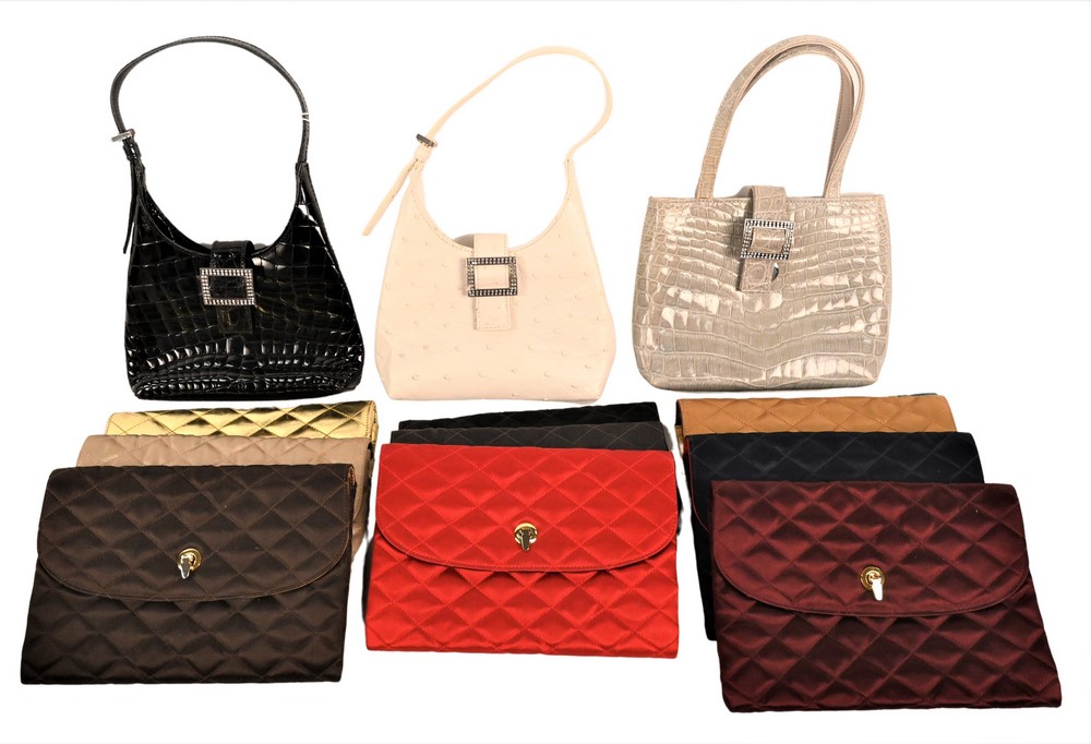 13 Piece Lot of OGGI Designer Evening Bags and Quilted Clutches, to include two small crocodile evening purses with rhinestone buckles, white ostrich evening purse with rhinestone buckle and 10 satin quilted pouches (one leather) with gold one toggle closure, all with general wear.