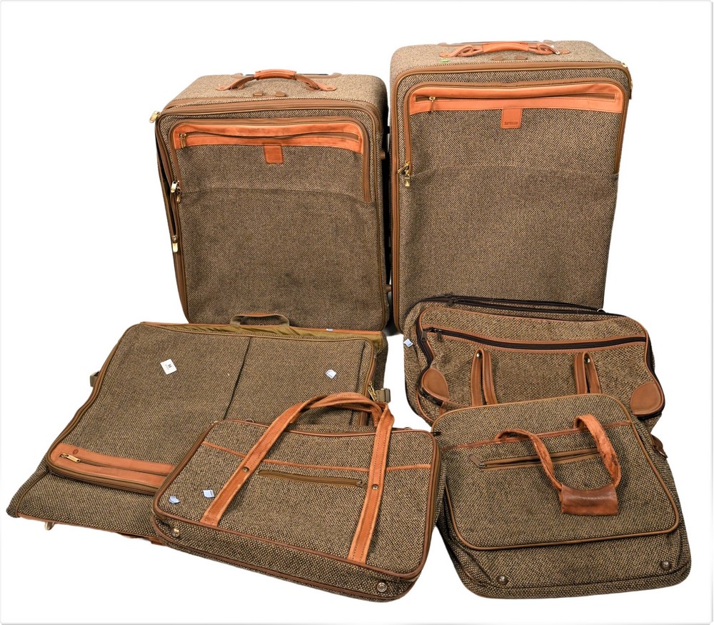 Six pieces of Tweed Hartmann Luggage and One Ventura Overnight, to include two large rollers, one fold over garment bag, two small carry ons, and one overnight Ventura bag, tallest hartman and Garment bag in used condition; largest height 24 inches, width 20 inches; all others in very used condition.