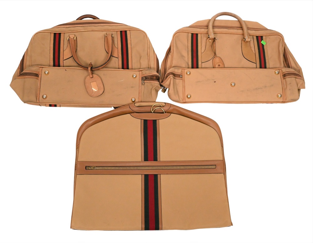 Three Piece Vintage Gucci Luggage, to include two overnight soft side travel bags along with one garment bag, travel bags with lots of staining, all zippers work, garment bag in good condition, has hangers, garment bag width 22 inches, length 38 inches.