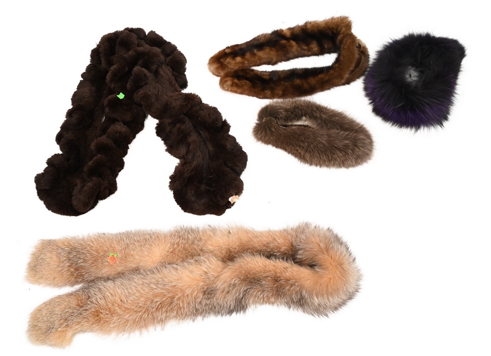 Six Piece Lot of Fur Fashion Accessories, to include purple fox headband, (possibly) coyote collar, brown ruffled rabbit neck piece, raccoon ear muffs, brown fur headpiece and brown mink collar, various sizes, condition consistent with normal wear, some staining.