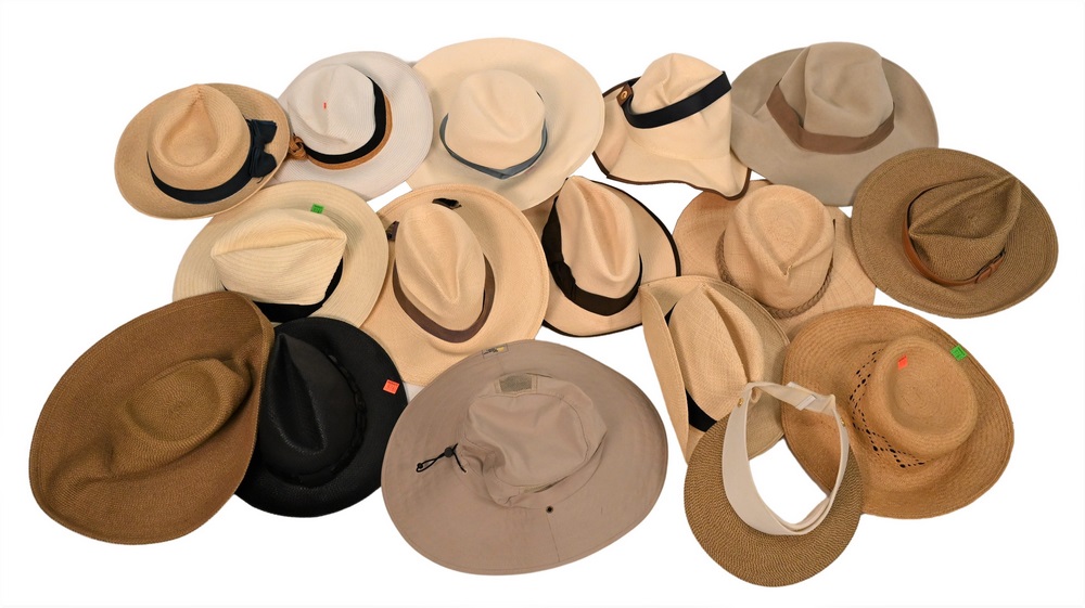 16 Straw, Jeet and Canvas Hats and Visors, designers include Tom Ford, Eric Javits, Lola, Larwin, along with others, in good condition with some breaks in straw and some with interior staining, sizes medium to large.