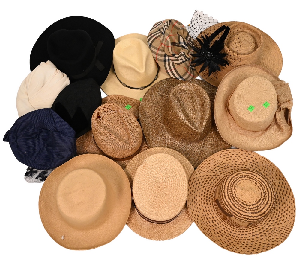 13 Piece Lot of Vintage and Contemporary Hats, to include womens vintage, mens Cavanaugh Boater, classic Burberry (size 5), straw cowboys, etc., various sizes, some breaks in straw hats, Burberry hardly worn.