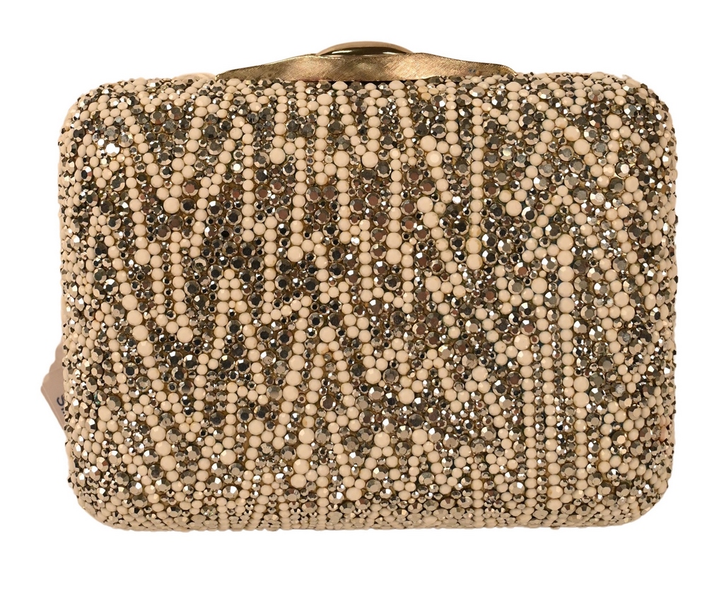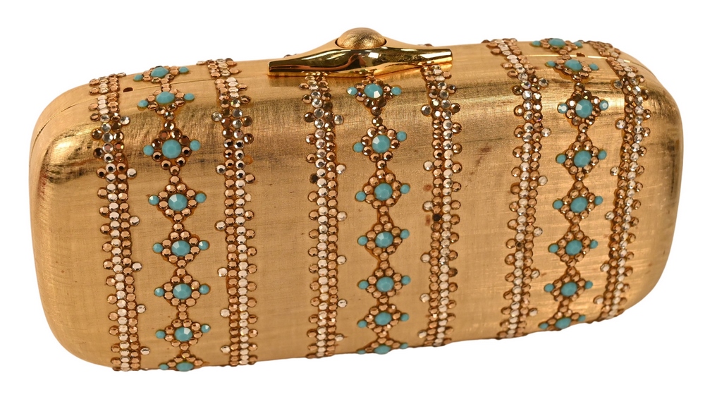 Five Piece Lot of Fendi Handbags, to include small gold snake skin, iridescent snake clutch, blue denim with applied beaded accents, grey knit with rhinestone buckle and woven tan, all having normal wear.