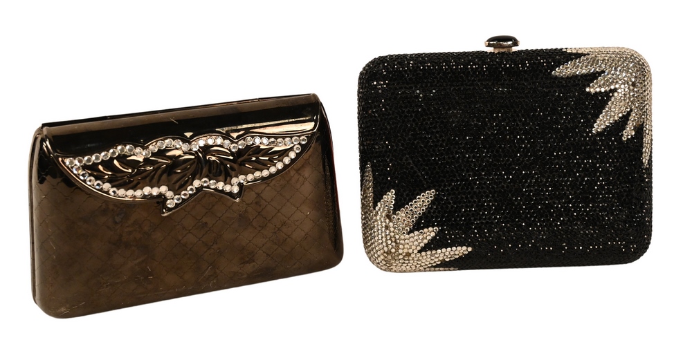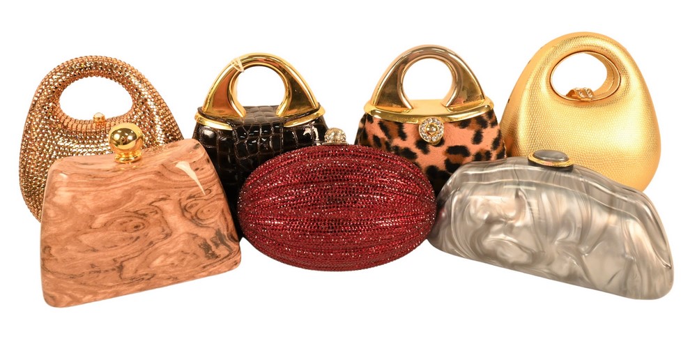Five Piece Judith Leiber Group, to include black lizard skin clutch purse with jeweled clasp, four belts with large clasps, along with five original boxes.