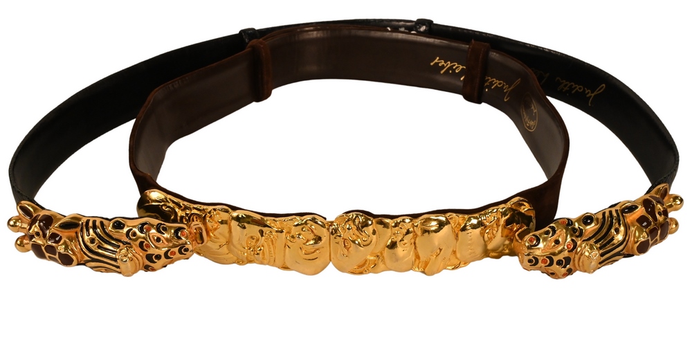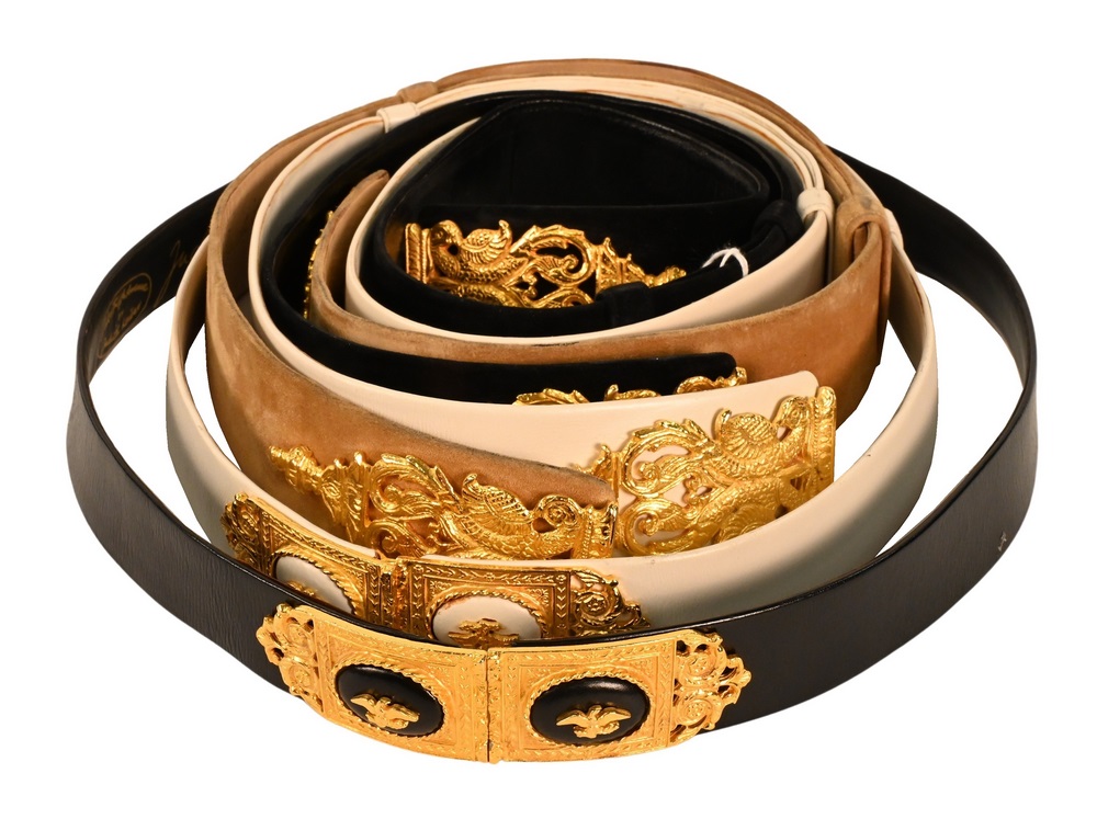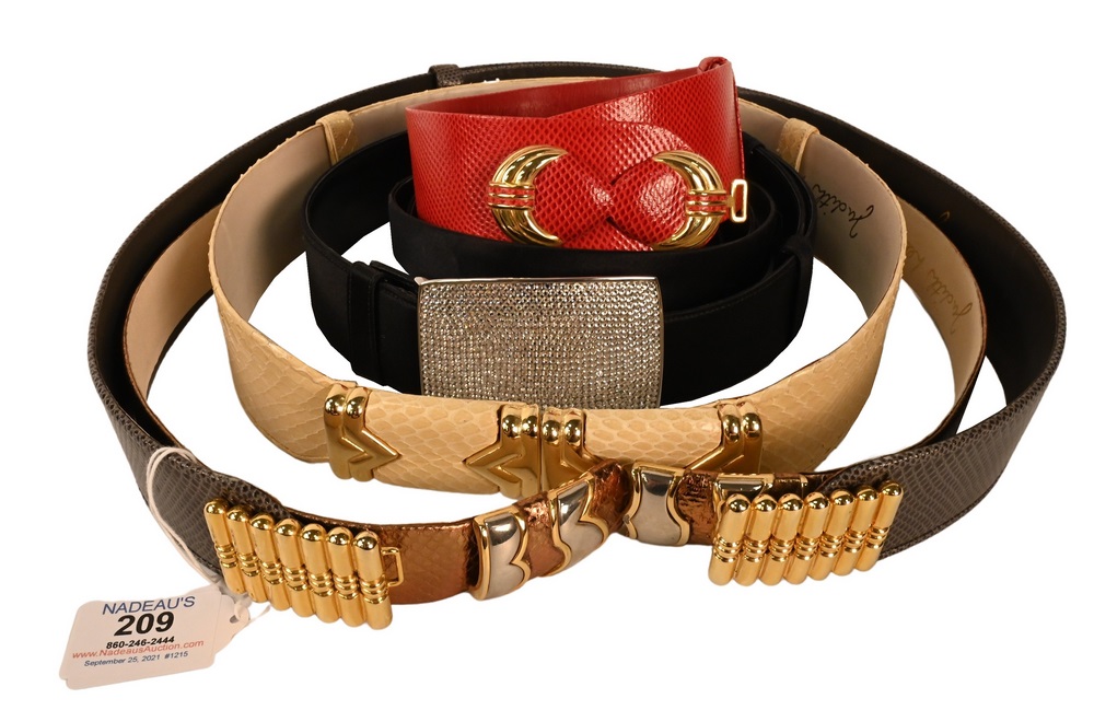 Five Piece Lot, to include two Judith Leiber belts, black, tan and white with matching belt buckles, along with a black and white having matching belt buckles.