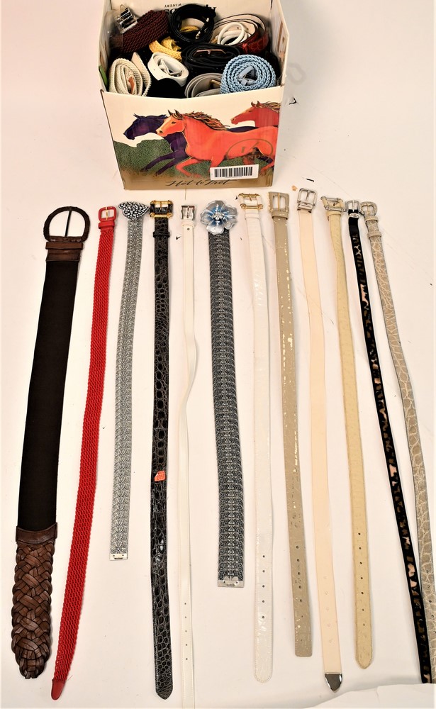 Large Lot of Ladies Belts, more than 40 pieces, to include leather, plastic, woven, Maus & Hoffman, OGGI, along with others, 36″ – 40″, in pre-owned condition.