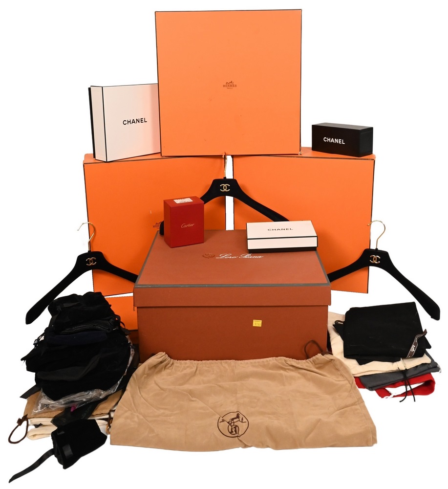 Miscellaneous Lot of Designer Boxes, Bags and Hangers, to include large Hermes hat box, Hermes brown ribbon, medium Hermes box, five Chanel boxes, leather sunglass case, Cartier box, along with five Chanel hangers, various sizes, large Hermes box has one split in top, otherwise in good condition.