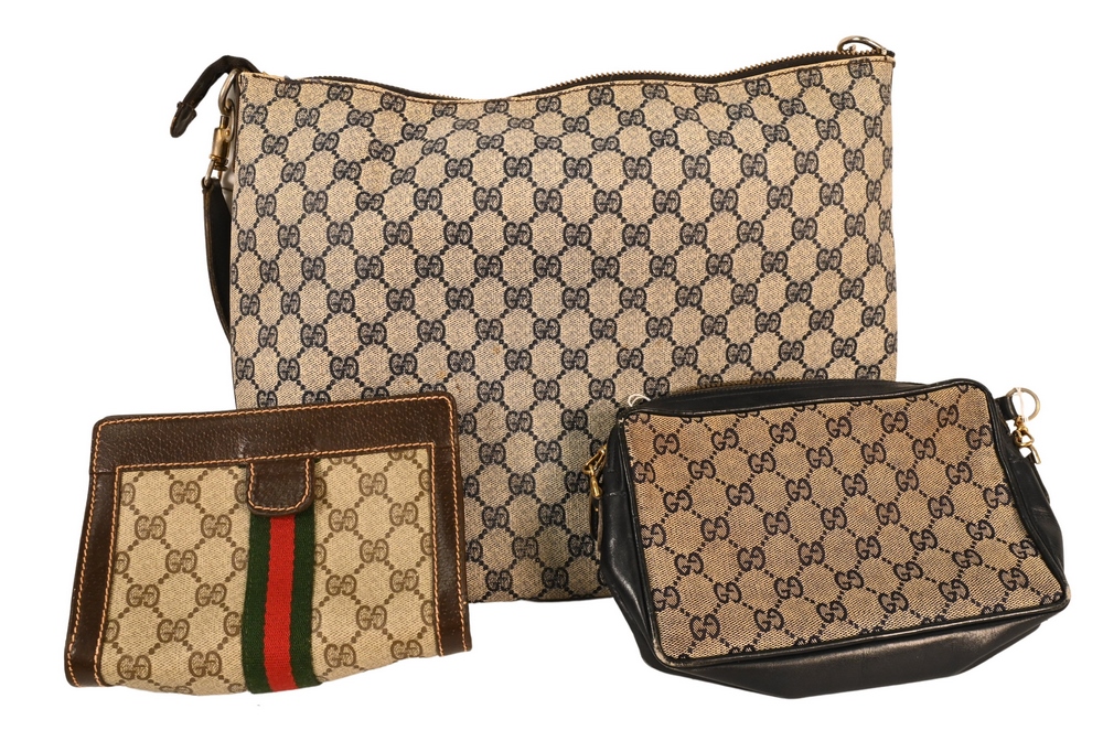 Three Piece Group, to include vintage Gucci logo bags and pouch, to include vintage blue satchel with fabric handle, brown pouch with leather trim and small blue shoulder bag, very well used.