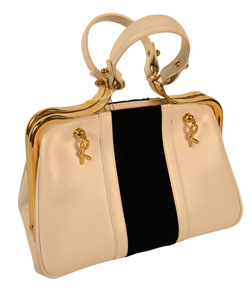 Roberta di Camerino Black and White Leather Satchel, having velvet stripe, gold tone hardware, single compartment bag with two interior pockets and double leather top handles, stains to lining, exterior scuff marks.