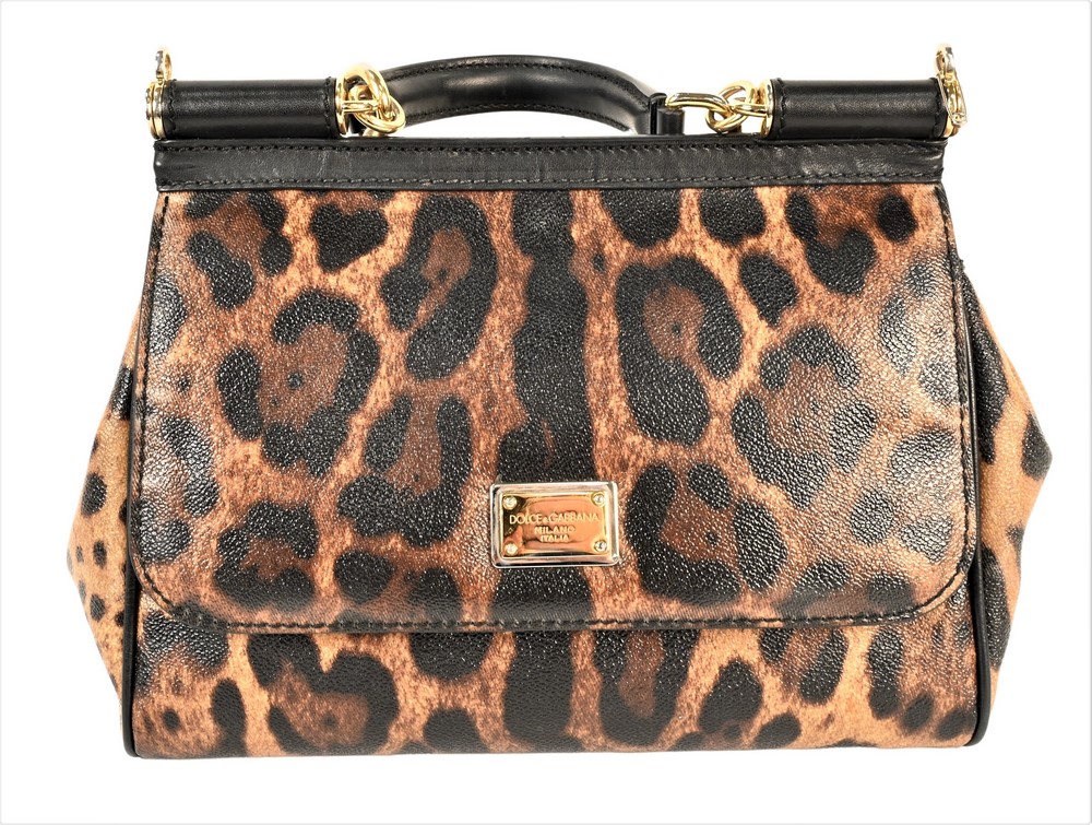 Dolce Gabbana Brown and Black Leopard Canvas Handbag, having fabric lined single compartment with zip and two slip pockets, fold over magnetic flap closure, gold tone hardware, “Miss Sicily Top” and leather bale handle, missing shoulder strap, height 7 inches.