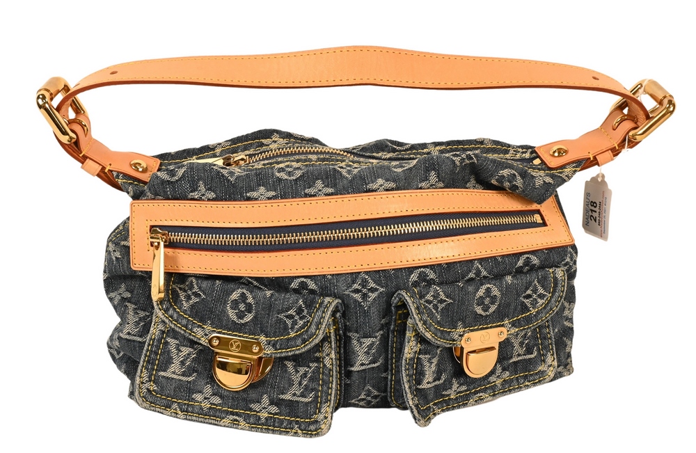 Louis Vuitton Denim “Baggy” PM Hobo Shoulder Bag, having single compartment suede interior with slip pocket, gold tone hardware, leather trim, three exterior pockets, single leather handle and top zip closure, interior clean with no issues, height 8 inches.