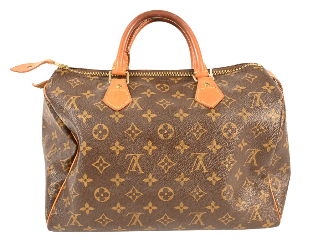 Louis Vuitton Canvas Logo Speedy Handbag, having double handle, single compartment, interior slip pocket, good patina on leather, some wear to leather piping, height 9 inches, width 13 inches.