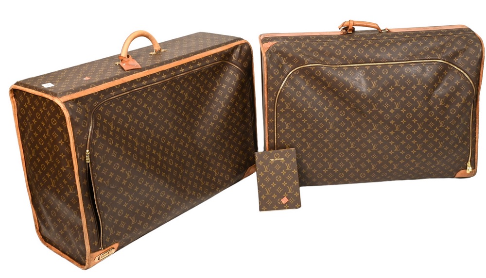 Three Pieces of Vintage Louis Vuitton Soft Side Luggage, large size, along with an address and telephone book, two large vintage suitcases, top handle, side zipper, one having brown interior the other having tan interior, one with combination lock, one handle replaced, interior staining, scratches and stains on both, zippers work, very well used, one has broken spine, small tears to canvas.