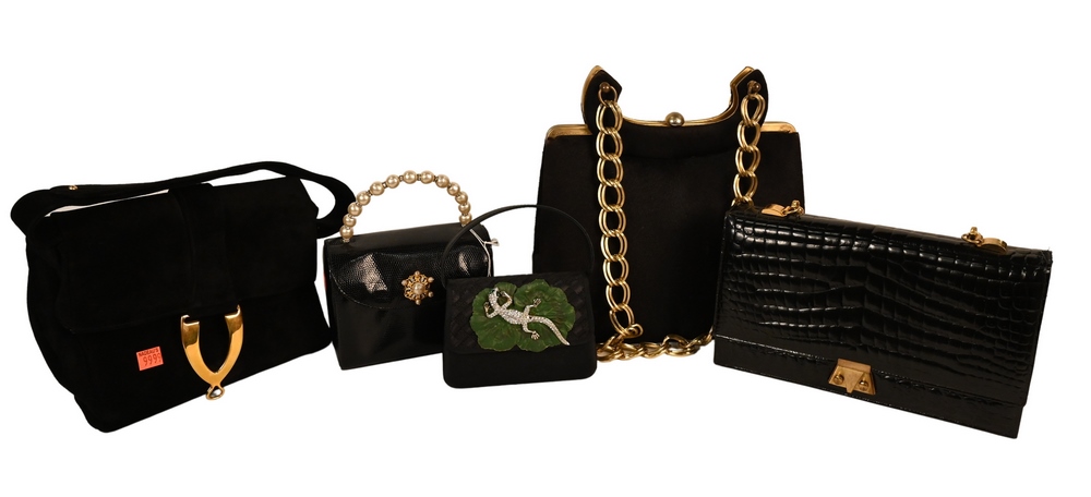Five Vintage Designer Handbags, to include tall black skin with large chain handle by Life, black suede, black embossed crocodile leather by Dofan, black box lizard bag by Lana of London, and small rhinestone lizard purse, lizard missing some stones.