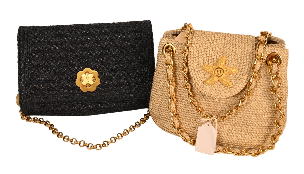 Two Piece Lot, to include a Eric Javits wicker starfish “Mini Squishee” handbag, blade man made wicker fabric starfish mini with bright yellow interior, two compartments, gold tone hardware and adjustable chain handle, along with a black wicker fabric single handle handbag with green interior, both bags like new, starfish height 6 1/2 inches, width 8 inches, depth 2 1/2 inches.