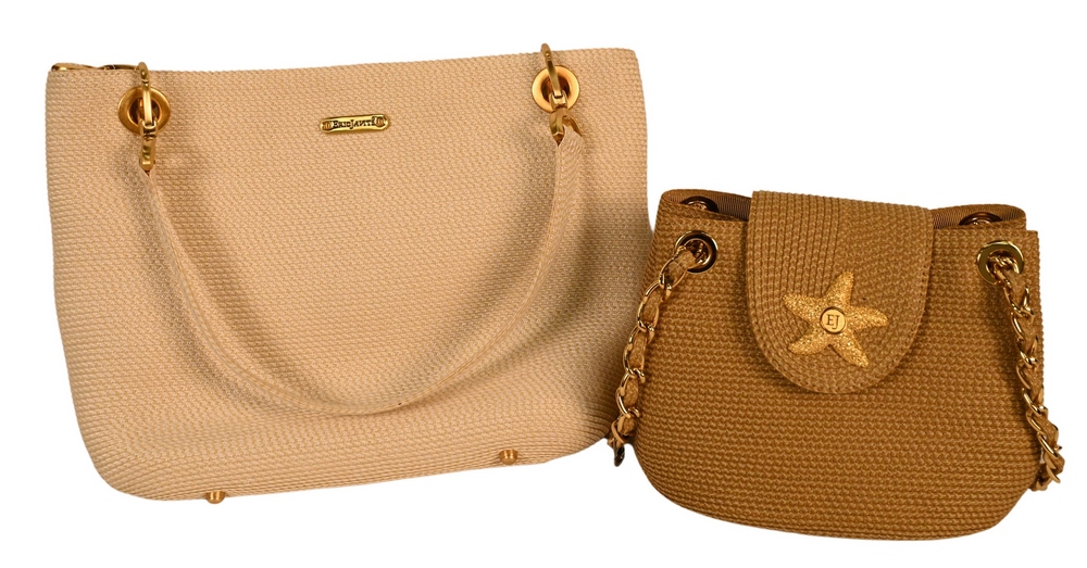 Two Piece Lot, to include Eric Javits tan starfish “mini squishee” handbag having bright yellow interior, gold tone hardware, and adjustable chain link handle, along with Javits double handle, Ivory wicker style handbag having gold tone hardware and pink fabric lining, gently used, starfish height 6 1/2 inches, width 8 inches, depth 2 1/2 inches.