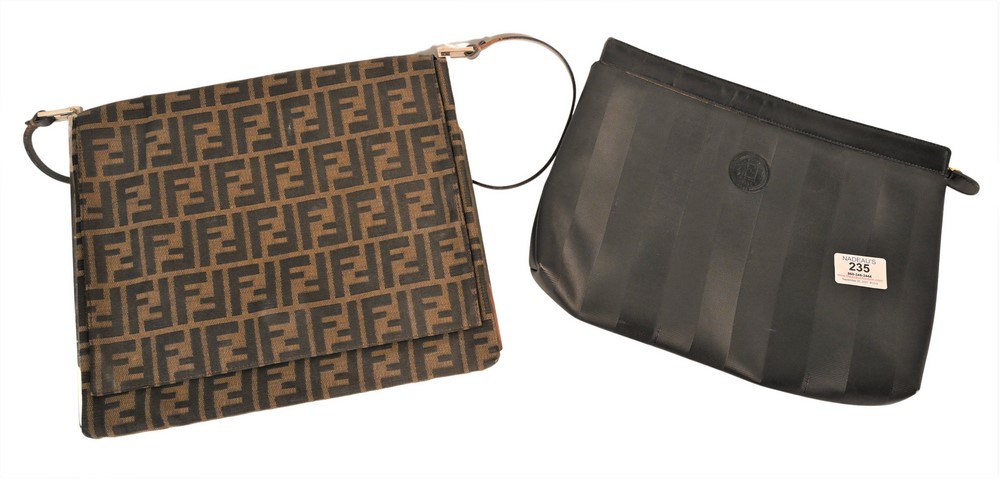 Lot of Two Fendi Bags, to include canvas leather flap shoulder purse along with a black leather clutch bag. Provenance: Connecticut Personal Collection of American Antiques and Oriental Rugs.