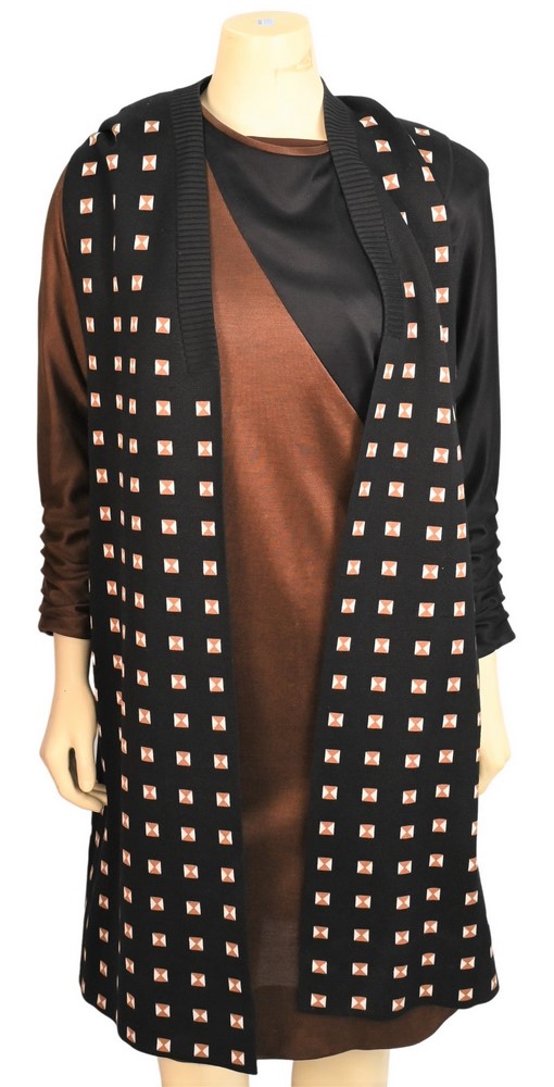 Hermes Dress and Knit Vest, black and brown jersey knit, zip back, ruched sleeve dress; along with a sleeveless knit vest with waist tie, size S/M, dress missing label, condition consistent with normal wear.