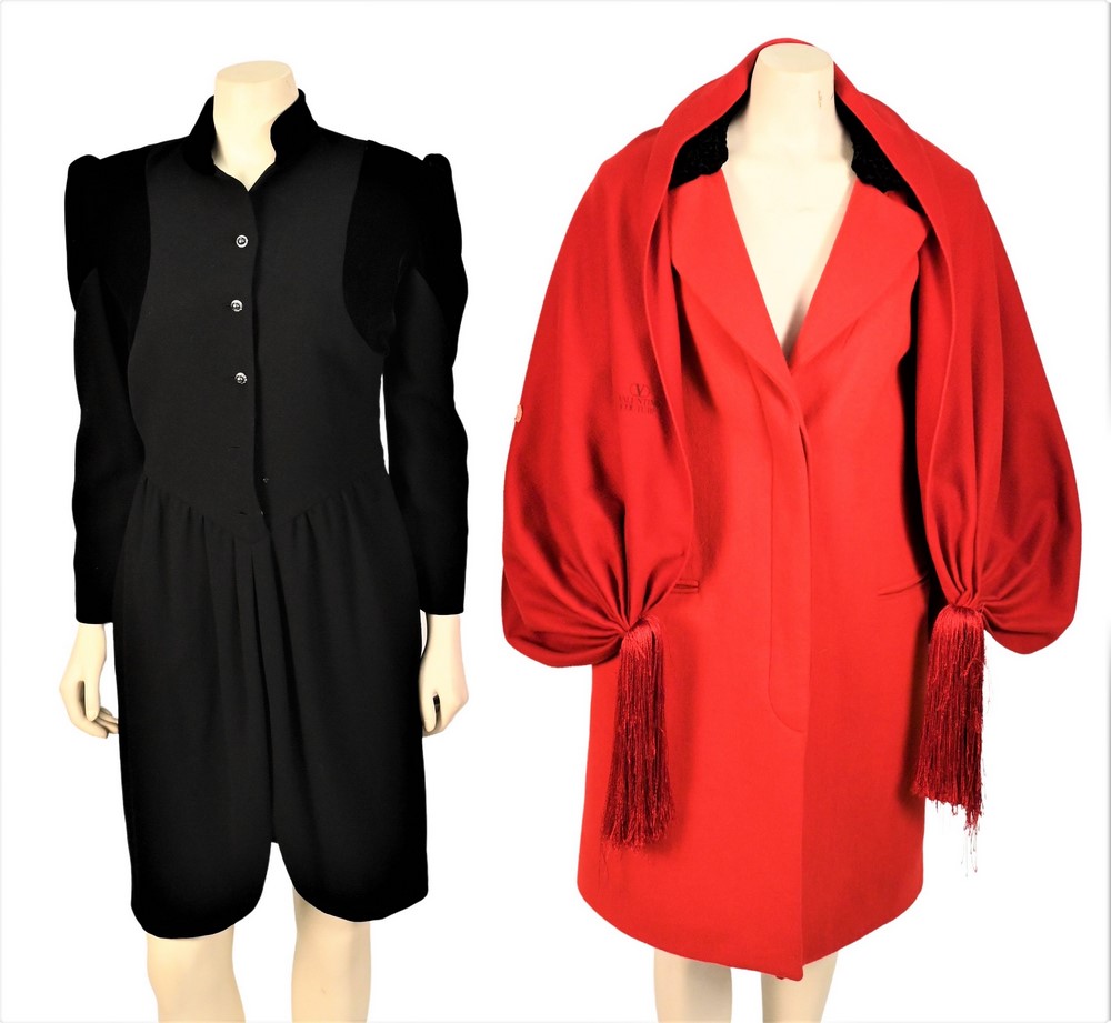 Vintage Valentino Shawl, Coat and Coat Dress, to include red wool and felt with red tassel ends by Valentino Couture; a velvet and black crepe coat dress by Valentino Boutique; along with a red cashmere coat with black lamb collar by Valentino Boutique; size S/M, condition consistent with normal wear, no issues.
